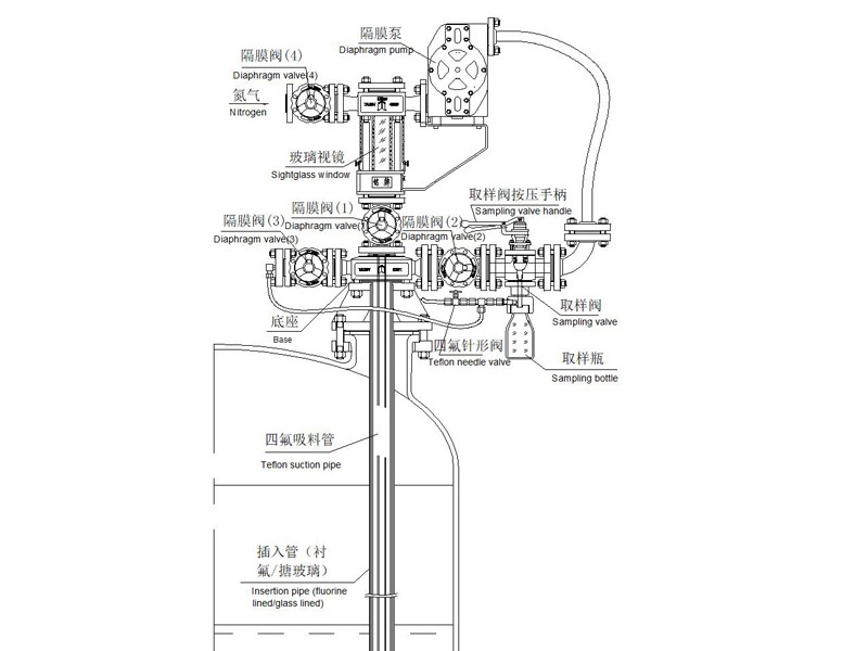 太极反应釜在线自动取样系统(AUTOMATIC SAMPLING SYSTEM)为防腐在线取样装置。取样物料接触各部件均采用里衬PFA、衬氟材质,达到防腐目的;四氟吸料管配套插入管(衬氟/雷竞技下载链接材质)浸于釜内料液以下,增加其过程的稳定性。隔膜泵以洁净压缩空气为动力,物料在取样系统中形成闭环循环回路,过程快捷、安全、无污染。